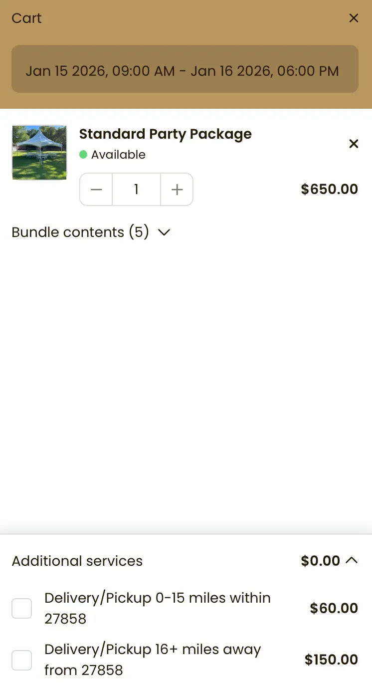 This is where each client MUST select the appropriate delivery fee. This is also where you can add other add-ons such as tent lighting. Again, we do not allow client pick ups or returns so the appropriate delivery option must be selected or it will be added by our staff upon receiving your booking.